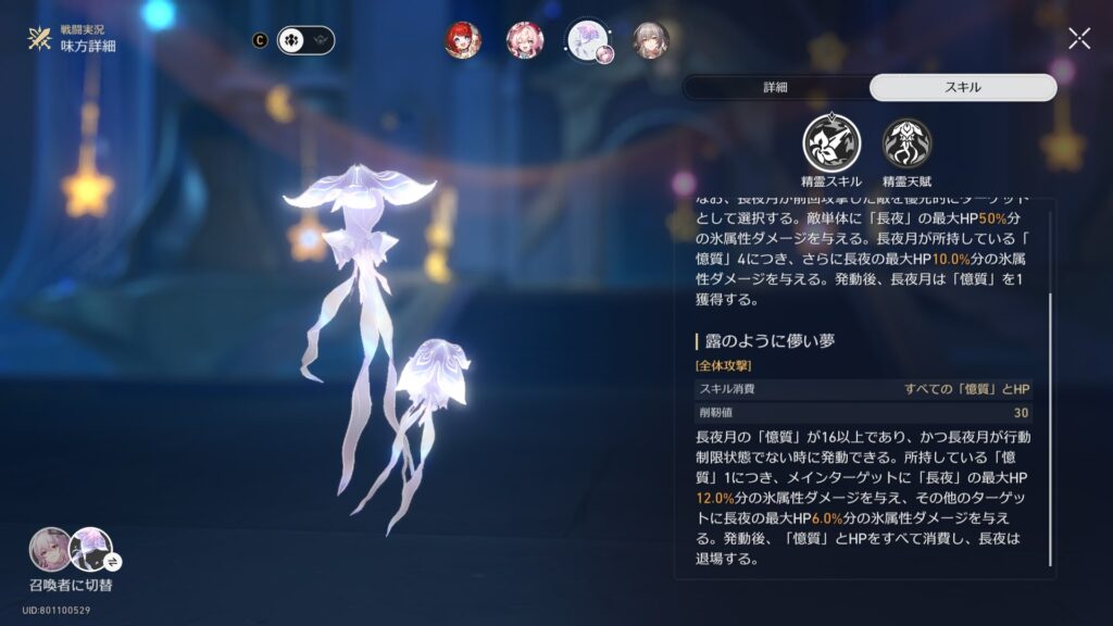 味方キャラ長夜月の「長夜」を使用して、「露のように儚い夢」を10回発動する