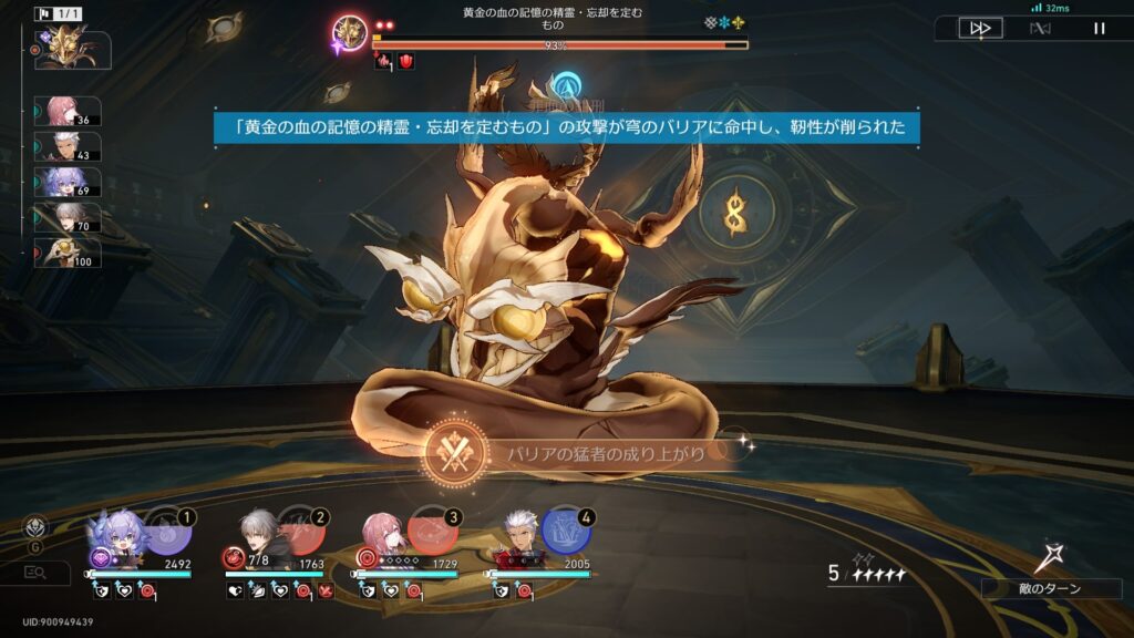 「黄金の血の記憶の精霊・忘却を定むもの」がロックオン中のターゲットに放つ3回の単体攻撃がすべてバリアに命中する
