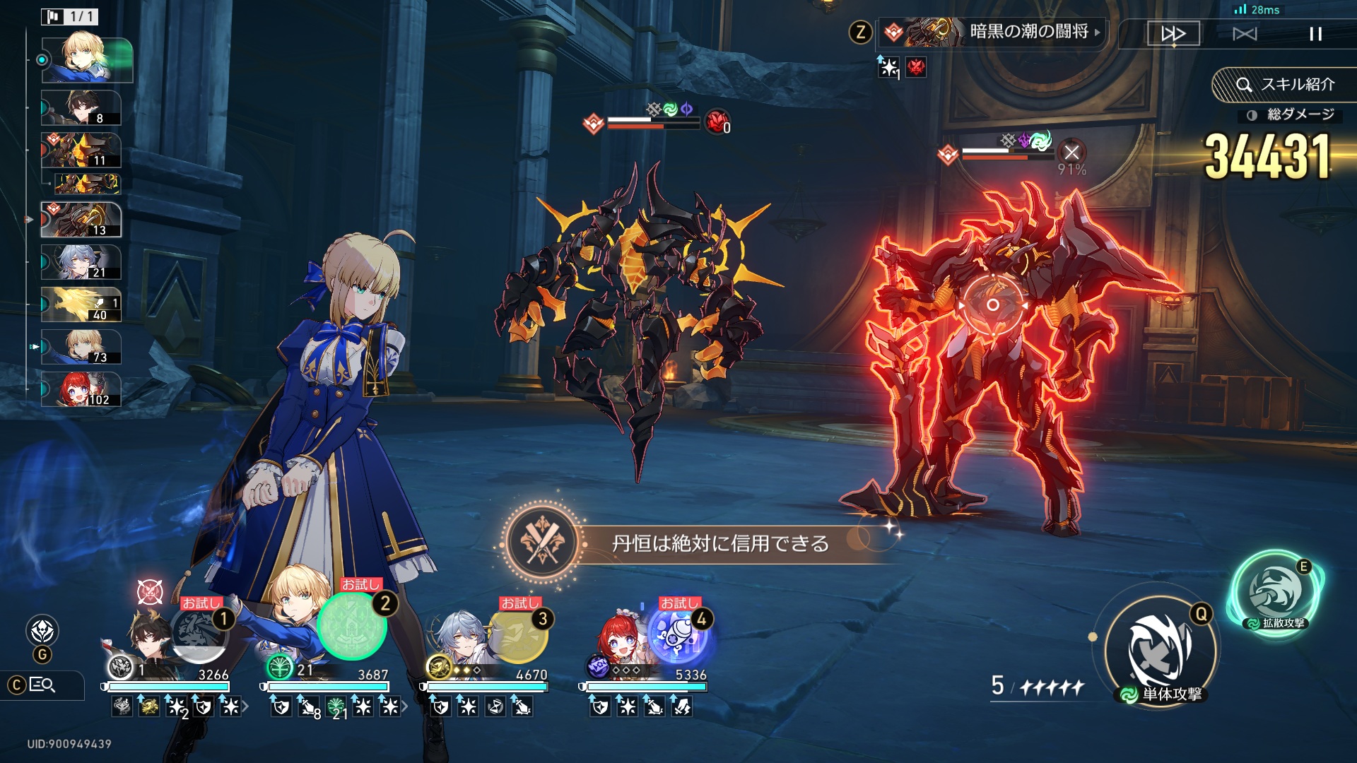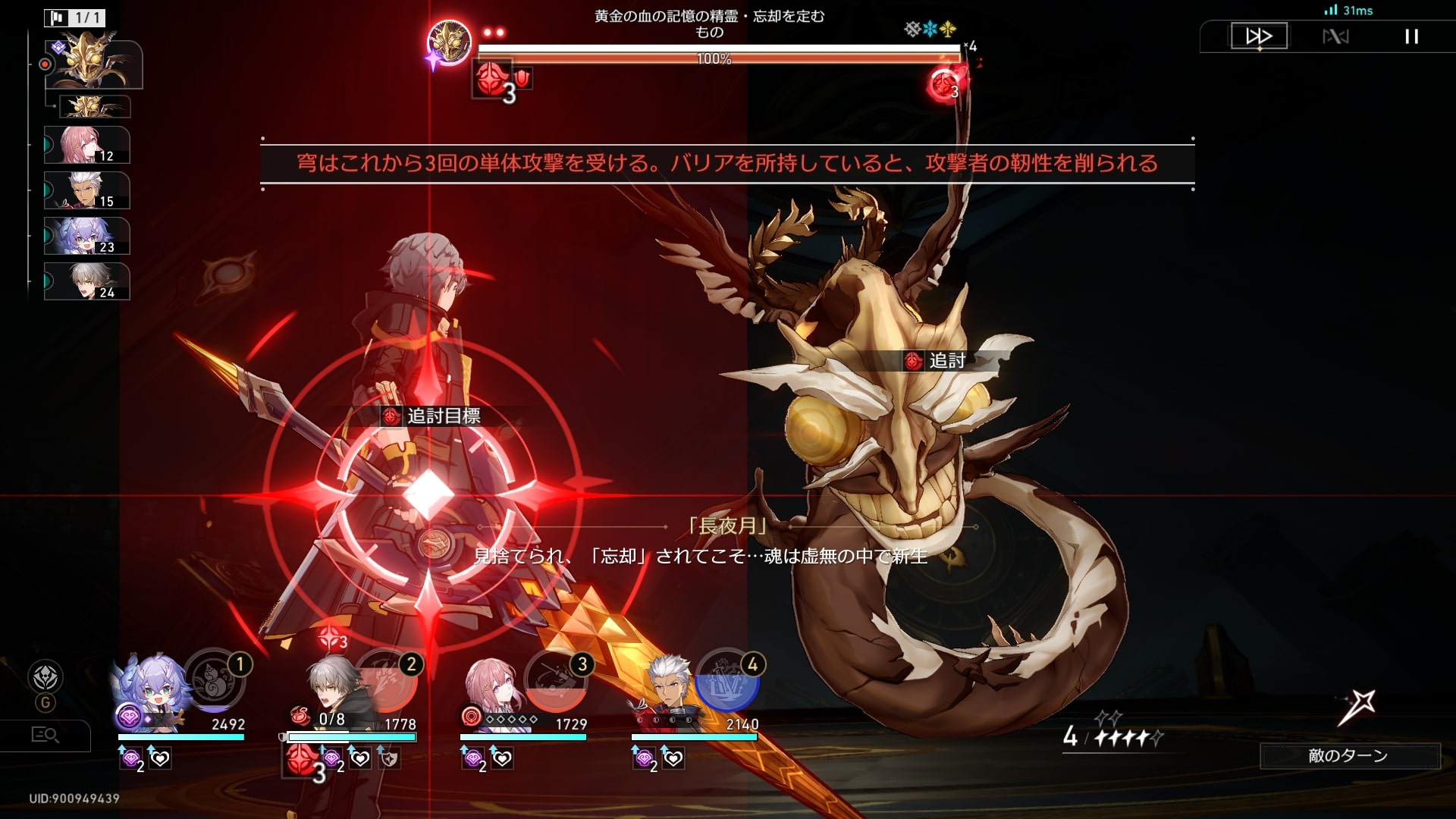 「黄金の血の記憶の精霊・忘却を定むもの」がロックオン中のターゲットに放つ3回の単体攻撃がすべてバリアに命中する