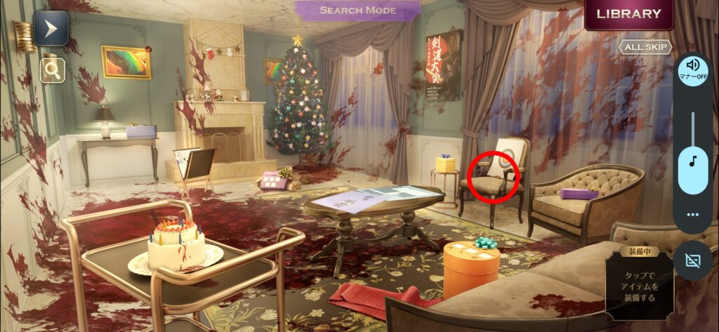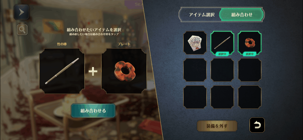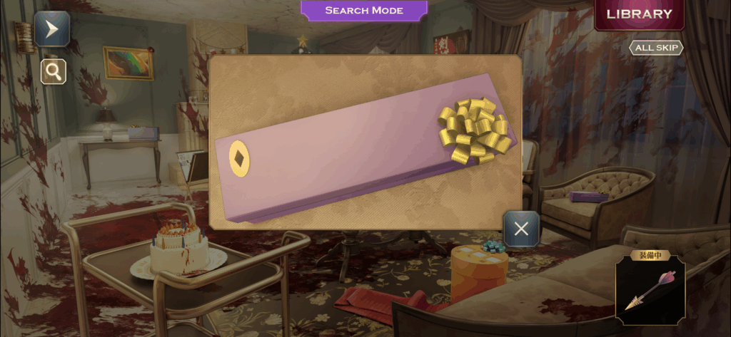 左奥のテーブル上にある箱を選択し、【メダル】を装備して右上の穴に入れると箱のボタンが青く光るので、先ほど覚えた黄色のろうそくのボタン位置を押すと開錠できます。(順不同)