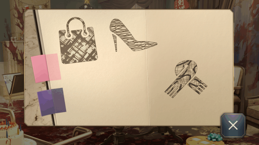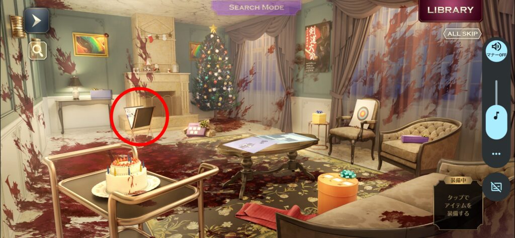 暖炉付近にあるボードを選択し、先ほどの【型抜かれたメモ】をボードに使用すると模様と柄が浮かんでくるので、模様に合わせて手前の円形の箱の模様を変更します。