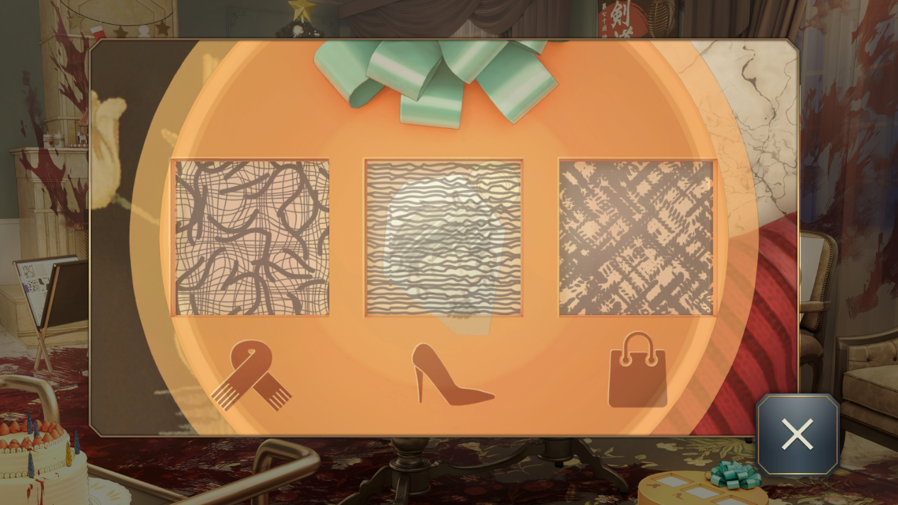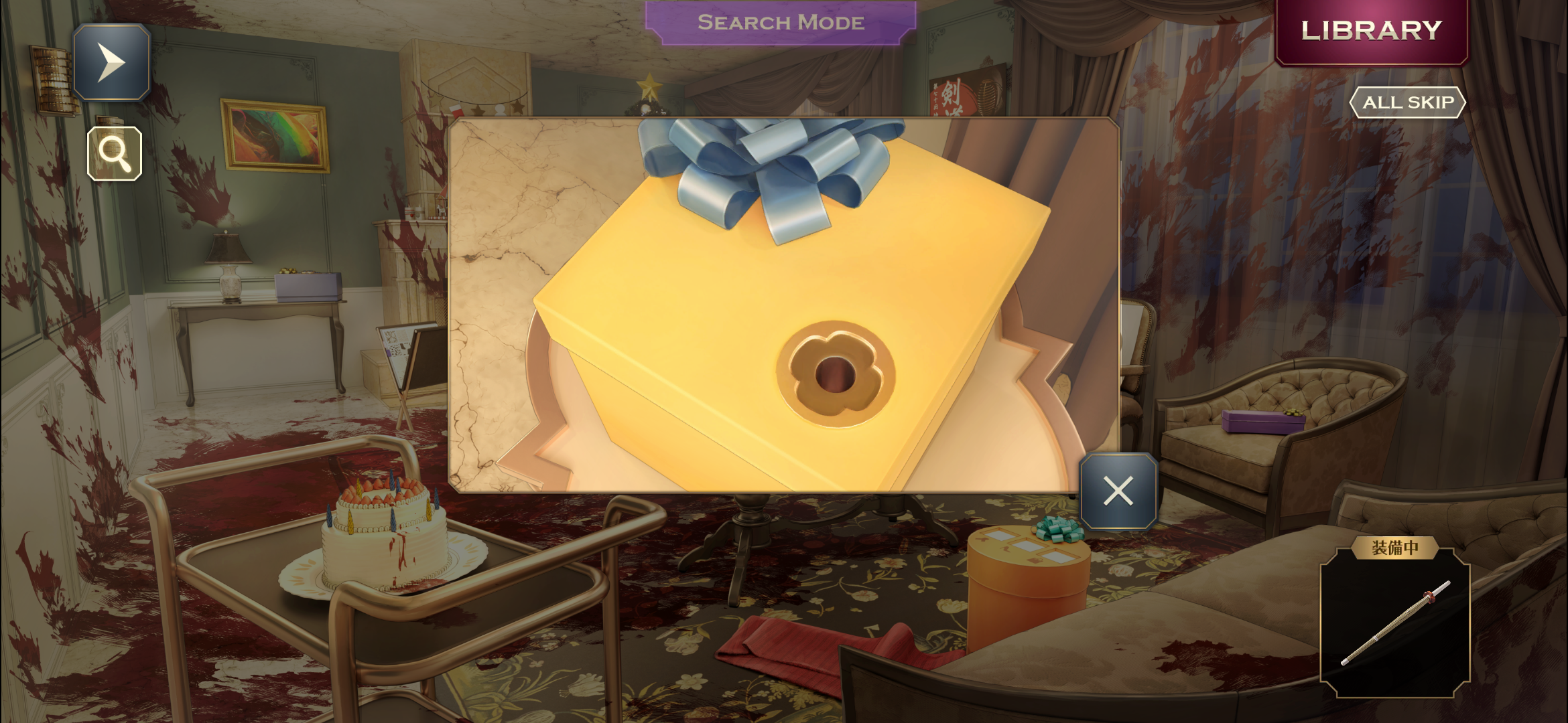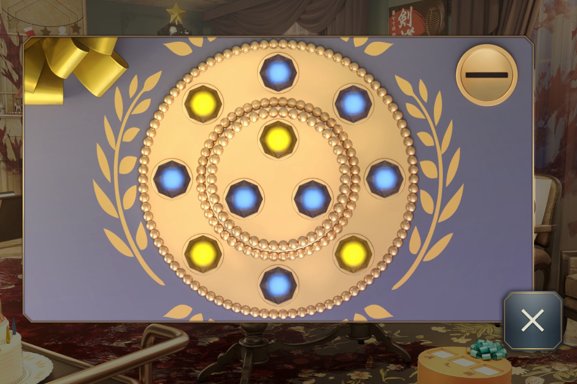 左奥のテーブル上にある箱を選択し、【メダル】を装備して右上の穴に入れると箱のボタンが青く光るので、先ほど覚えた黄色のろうそくのボタン位置を押すと開錠できます。(順不同)