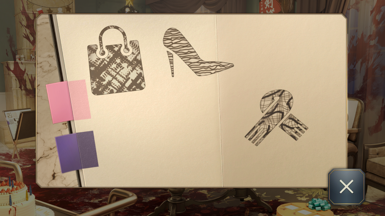 暖炉付近にあるボードを選択し、先ほどの【型抜かれたメモ】をボードに使用すると模様と柄が浮かんでくるので、模様に合わせて手前の円形の箱の模様を変更します。