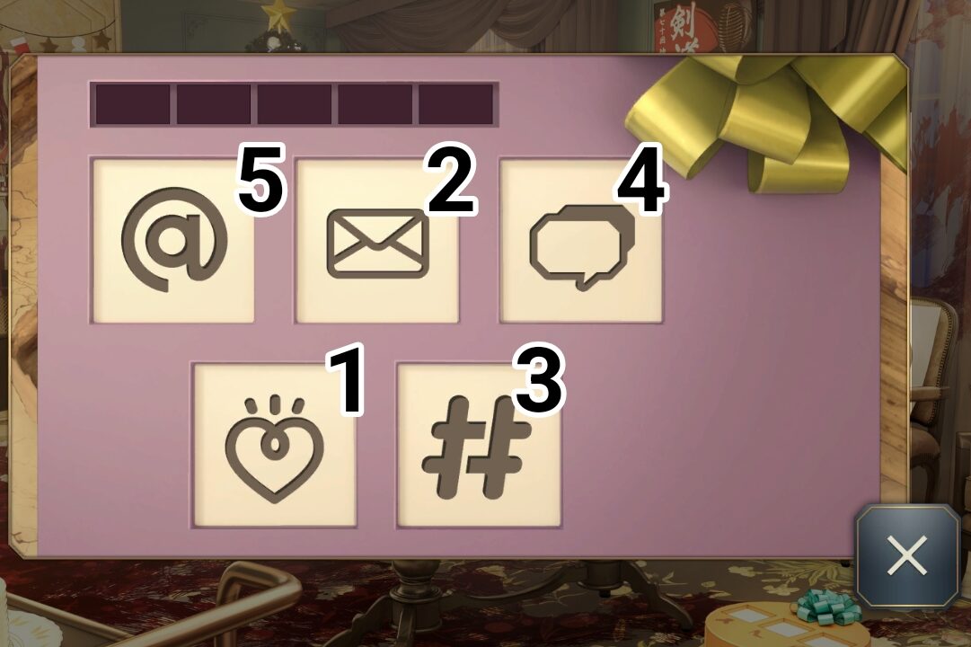 【額入りの家族写真】をアイテム選択+から確認すると模様と矢印が確認でき、矢印の順番に「ハート」→「メール」→「シャープ」→「吹き出し」→「@」が並んでいる分かるので、ツリー下の箱を調べ、先ほどの順番道理に模様を選択します。