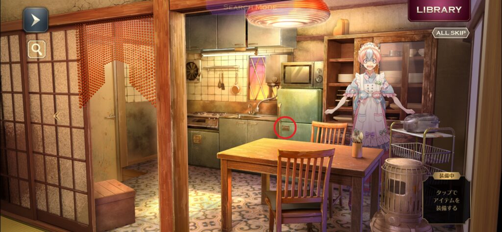 タイルが4枚集まったら、右マップのガスコンロ下の棚を調べます。