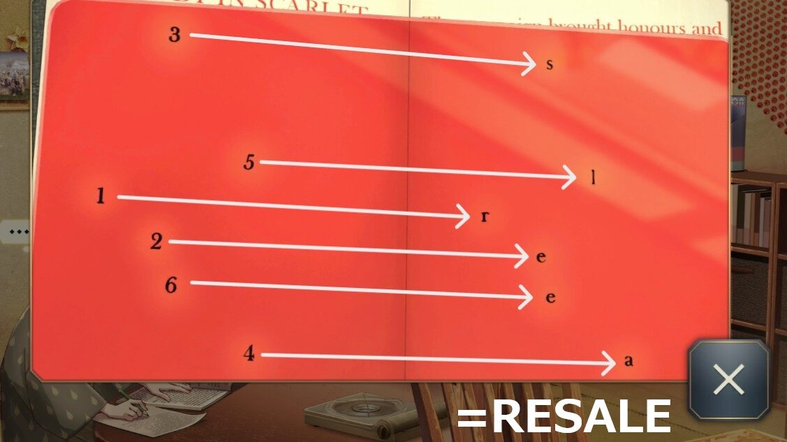 数字と数字はページごとに同じ位置に配置されており、数字の順番で文字を並べると「resale」という単語が出てきます。