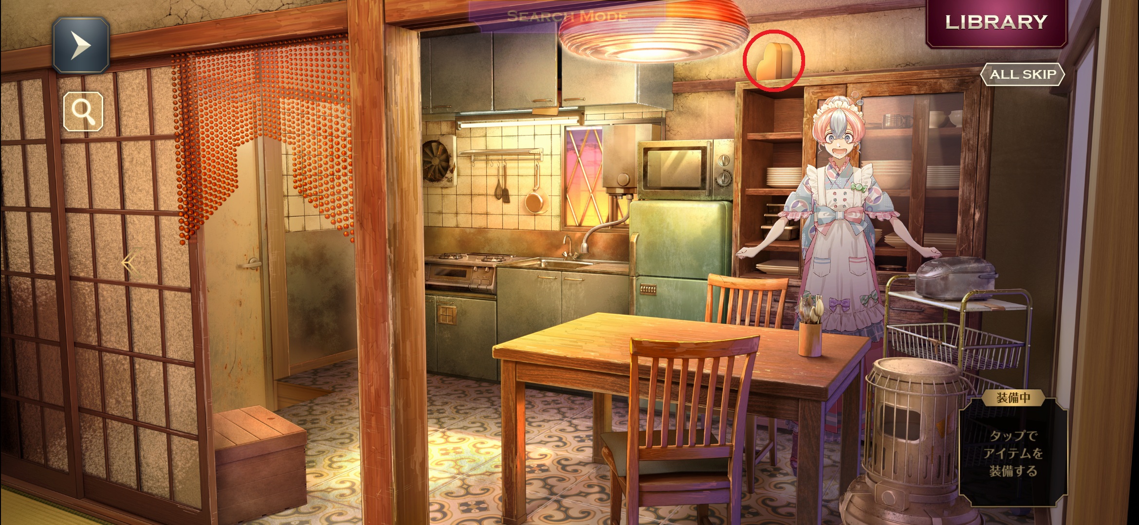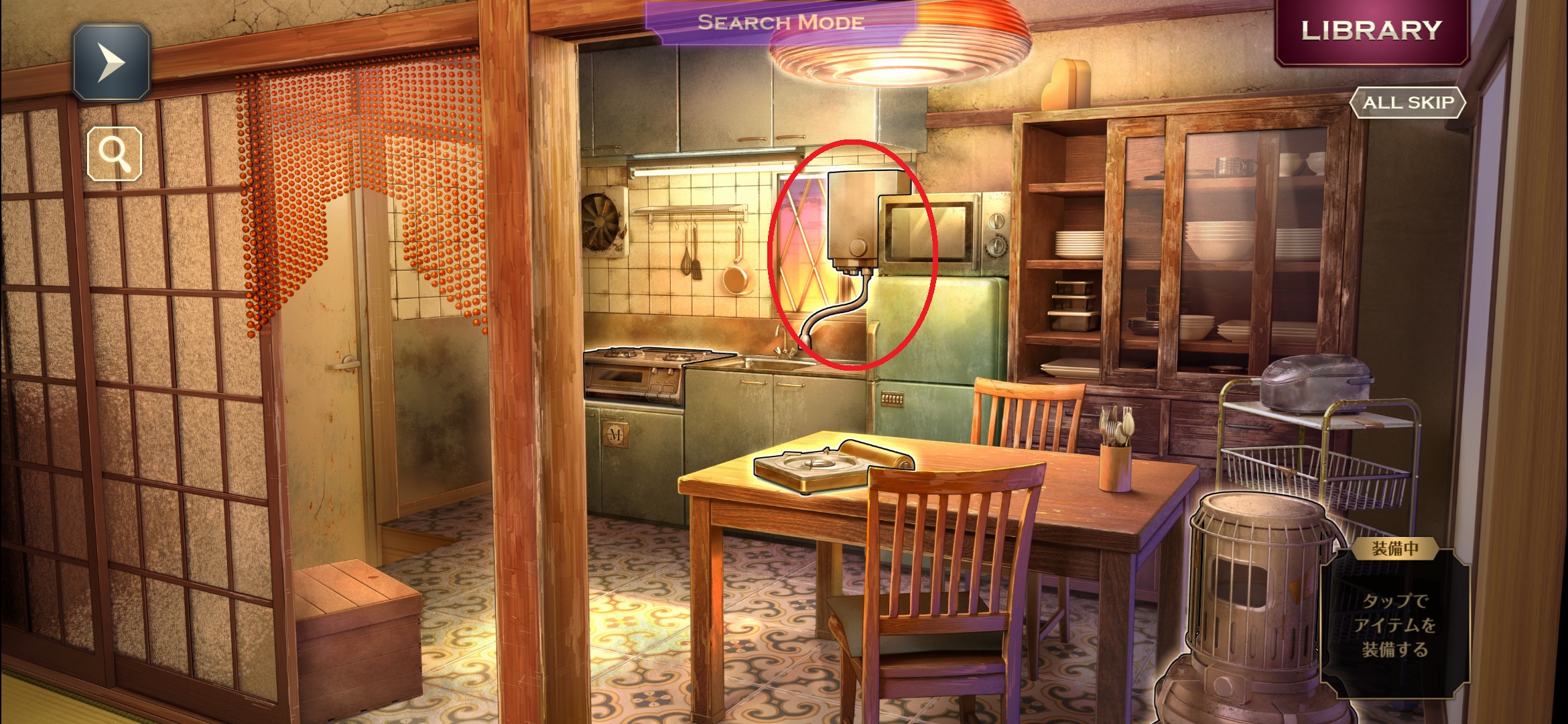 タイルが4枚集まったら、右マップのガスコンロ下の棚を調べます。
