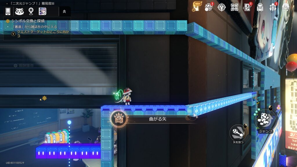 「二次元ジャンプ!」で方向転換できる矢を放つ